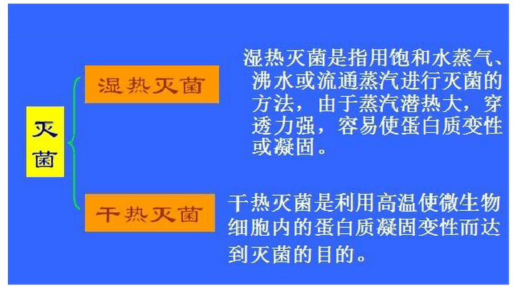 壓力:100KPa,水蒸氣的溫度:115℃,時間:20min,可殺死各種微生物和它們的孢子 壓力:147KPa,水蒸氣的溫度:121℃,時間:15~30min ,各種微生物和它們的孢子或芽孢
