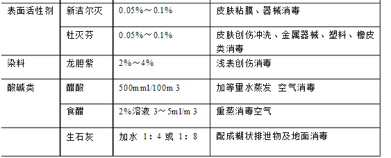具有殺死微生物的化學藥物稱消毒劑。消毒劑對人體有毒性作用,只能外用,不能內服。主要用于皮膚粘膜的傷口、器械、排泄物和周圍環境的消毒。消毒劑在低濃度時也可作防腐用,但防腐劑的關鍵是應要對人體無毒性作用。消毒劑種類濃度與用途見表 13-1。                        常用消毒劑的種類濃度與用途